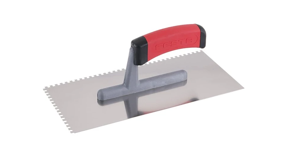 Rozsdamentes fogazott simító FESTA 280x130 mm, e4 fog, gumi nyéllel, lemezvastagság 0,8 mm. Elsősorban csempék és burkolatok alá ragasztók felhordására, valamint esztrichek, stukkó, vakolatok, tömítőanyagok és egyéb építőanyagok felhordására használják. A rozsdamentes fogazott simító lehetővé teszi a ragasztó vagy építőanyag nyújtását csíkokban és a simító fogának megfelelő magasságban.