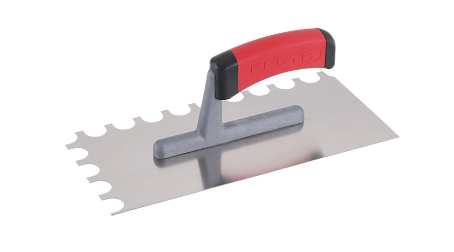Rozsdamentes fogazott simító FESTA 280x130 mm, O16 fogú, gumi nyéllel, lemezvastagság 0,8 mm. A teherhordó területeken a burkolat alatti ragasztó nyújtására szolgál.