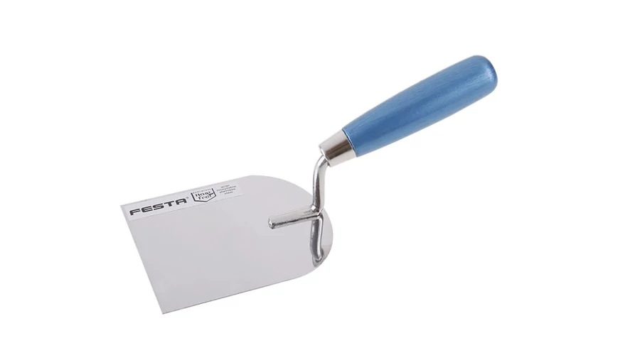 Radírozó kanál rozsdamentes acél FESTA 100 mm, fa nyéllel. Minőségi rozsdamentes acél. Az építőiparban befejező munkákhoz használják.