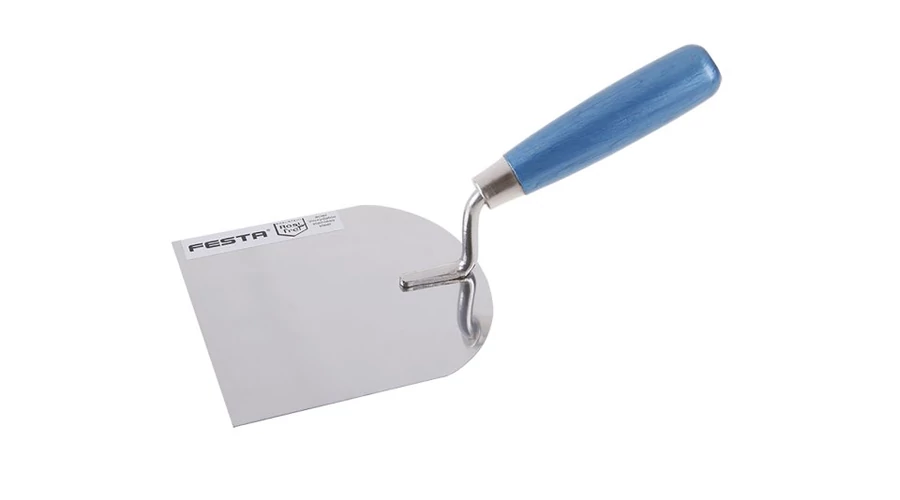 Radírozó kanál rozsdamentes acél FESTA 120 mm, fa nyéllel. Minőségi rozsdamentes acél. Az építőiparban befejező munkákhoz használják.