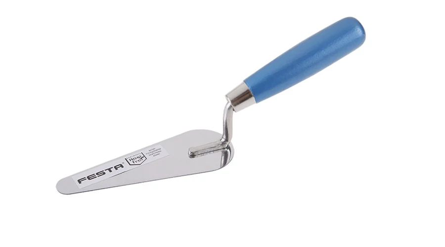 Rozsdamentes acél macskanyelv kanál FESTA 140x75 mm, fa nyéllel. Gipsz, stukkó stb. tisztítására és kezelésére szolgál. A kanál rozsdamentes acélból készült (1,0 mm vastag).
