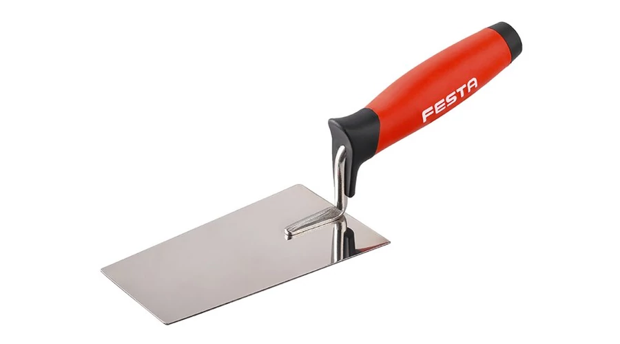 Rozsdamentes acél kanál FESTA 120 mm gumi nyéllel. Ez a kőműves kanál szálcsiszolt minőségi rozsdamentes acélból készült, ergonomikusan kialakított nyéllel a kényelmes fogás érdekében. Ezt a szálcsiszolt rozsdamentes acélból készült kőműves simítót falazáshoz, vakoláshoz és falazatok, például pórusbeton, tégla, tömb, kő lerakásához használják.
