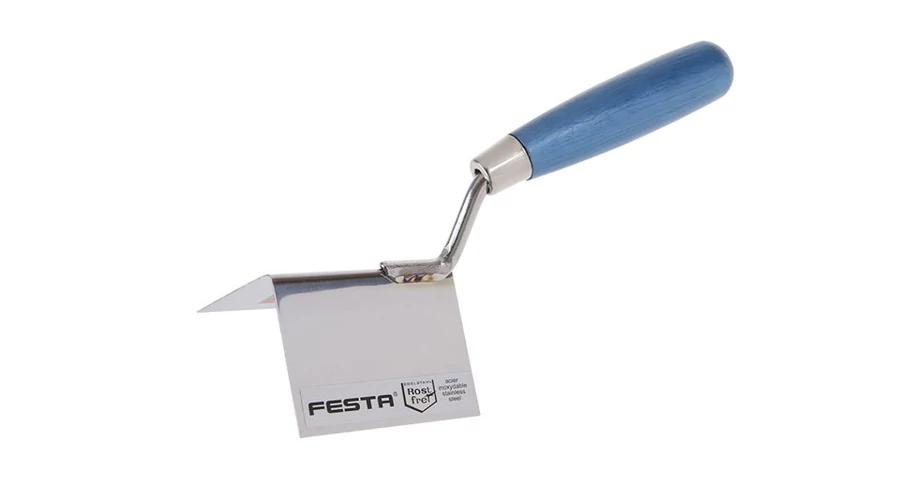 Saroksimító rozsdamentes kanál FESTA 80 x 60 x 60 mm, fa nyéllel. A sarokkanál minőségi rozsdamentes acélból készült, vastagsága 1,0 mm, nyele fából készült, lakkozott felülettel. A radír a külső és a belső sarkok beállítására és tisztítására szolgál.