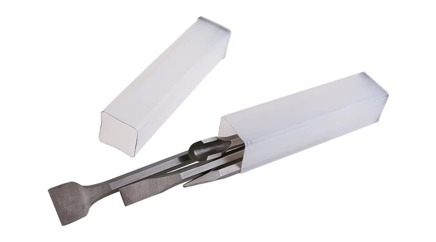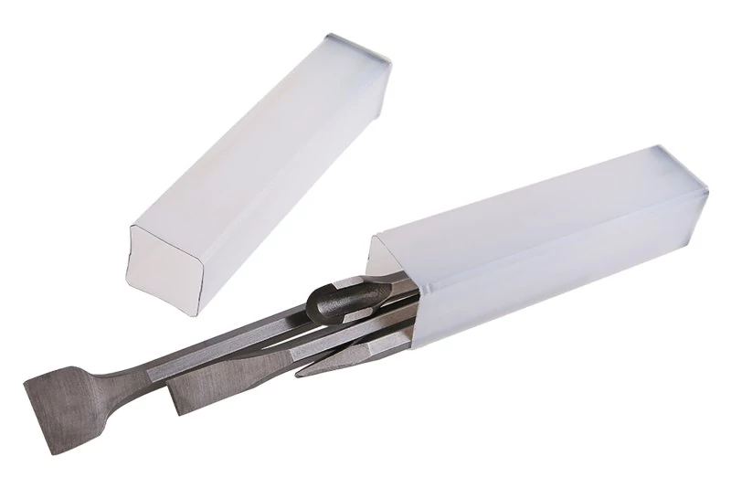 Vésők - 4 darabos készlet, négy véső kombinációja aprításhoz, bontáshoz, hornyoláshoz, falazat, beton, csempék, járólapok, kő, ..., elektromos bontókalapácsokba való rögzítéshez SDS + rögzítéssel, (gépekben SDS MAX rögzítés adapterrel kombinálható, cikkszám 20744), összetétel: 2 véső, 1 szemfog, 1 horony, csomagoló műanyag tok.