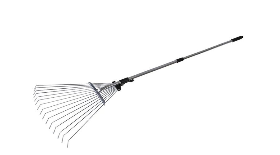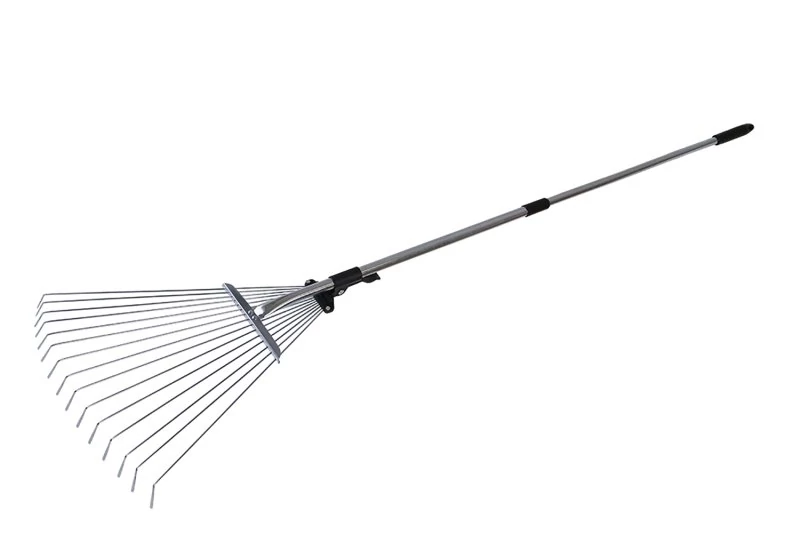 Svéd gereblye fém klipsszel - biztonsági berendezés, állítható pengetávolság, teleszkópos nyél, felhasználás: levelek, fű gereblyézésére.