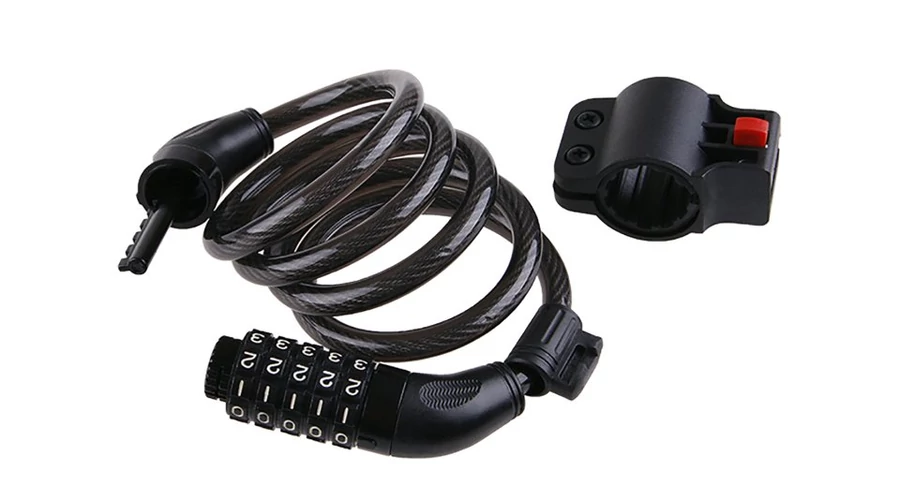Könnyen hordozható. Kódzárolás 5 szám kombinációjával. Könnyen rögzíthető a kerékpárhoz az ülésrúdon lévő kapcsnak köszönhetően. Anyaga: rugalmas vinil bevonatú acél drótkötél.