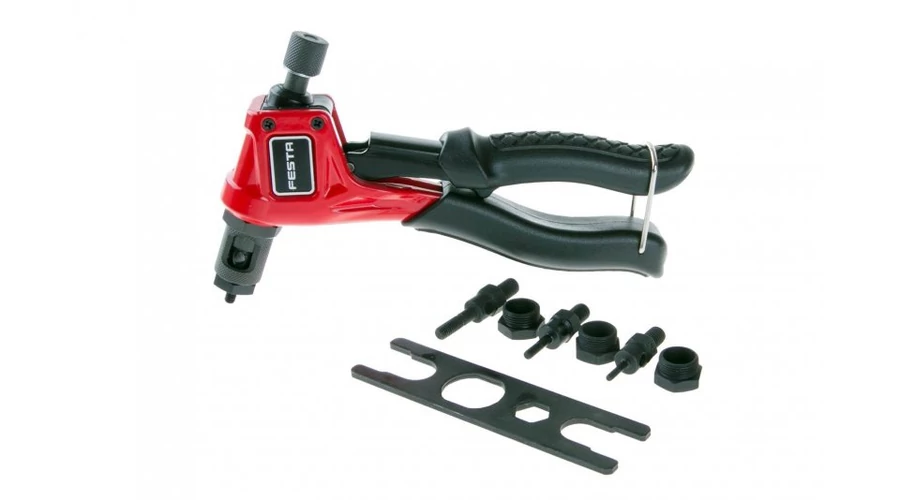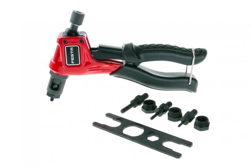 Professzionális szegecselő fogó szegecsanyákhoz / anyaszegecsekhez. Hossza 200 mm. M3, M4, M5, M6 anyákhoz, anyagokból: alumínium, sárgaréz, acél és rozsdamentes acél. 4 db szegecsadapter jár hozzá. A fogó Cr-Mo anyagból, szénacélból és PVC-ből készül. Egy szegecsanyával szegecselt csatlakozásban sértetlen menet jön létre, amelyhez könnyen csatlakoztathat más alkatrészeket.