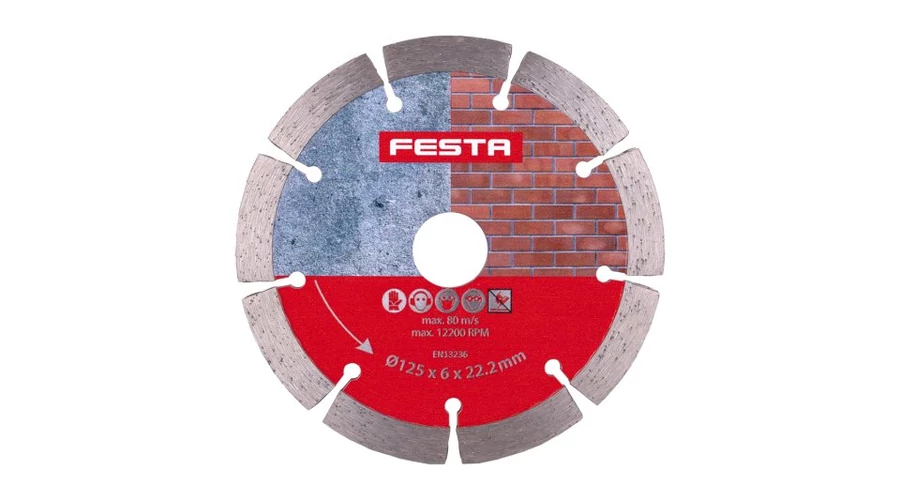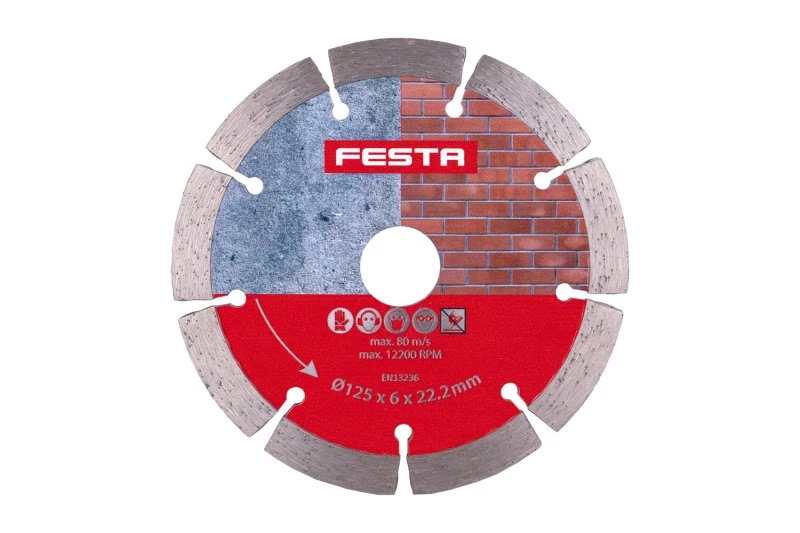 FESTA dupla gyémántszegmens tárcsa hornyoláshoz, 125 x 6 mm, furat átmérője 22,2 mm, a tárcsa előnye, hogy normál sarokcsiszolóba is befogható! Minőségi gyémánt szegmensek nagy arányban gyémántszemcsékből, kiváló minőségű acélból készült hordozótárcsára lézerrel hegesztett szegmensek. A felhasznált anyagoknak és a megmunkálásnak köszönhetően a tárcsa nagyon hosszú élettartamot biztosít!