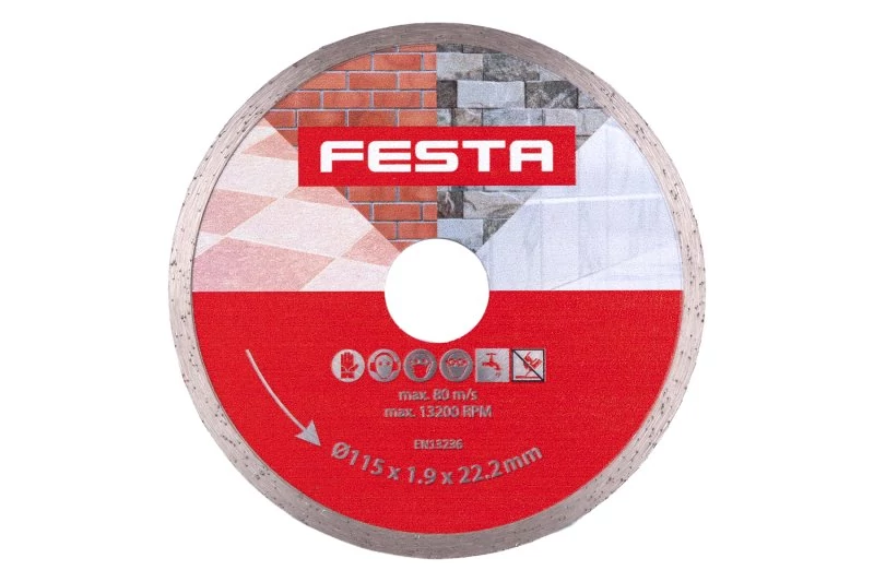 FESTA professzionális gyémántpenge, kivitel: FULL - körbefutó, kiváló minőségű gyémántréteg magas gyémántpor tartalommal, precíz megmunkálás - magas hőmérsékletnek ellenálló tárcsatartó koronghoz való csatlakozás, felhasználás: burkolat nedves és száraz vágására szolgál és csempézés, beton, tégla, falazat, gránit, márvány, kő, üveg, kerámia, csomagolás: eurólyukkal ellátott buborékfólia, méretek: a termék megnevezésében szerepel.