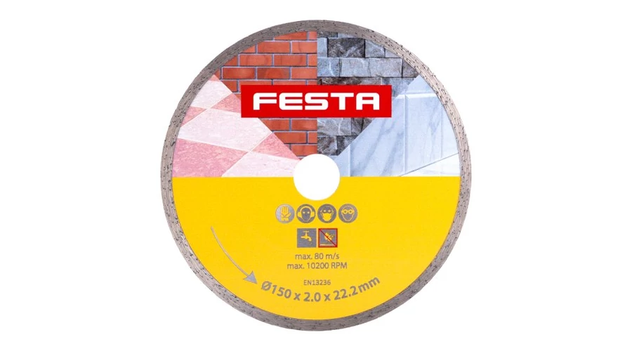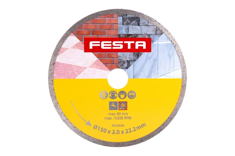 FESTA professzionális gyémántpenge, kivitel: FULL - körbefutó, kiváló minőségű gyémántréteg magas gyémántpor tartalommal, precíz megmunkálás - magas hőmérsékletnek ellenálló tárcsatartó koronghoz való csatlakozás, felhasználás: burkolat nedves és száraz vágására szolgál és csempézés, beton, tégla, falazat, gránit, márvány, kő, üveg, kerámia, csomagolás: eurólyukkal ellátott buborékfólia, méretek: a termék megnevezésében szerepel.