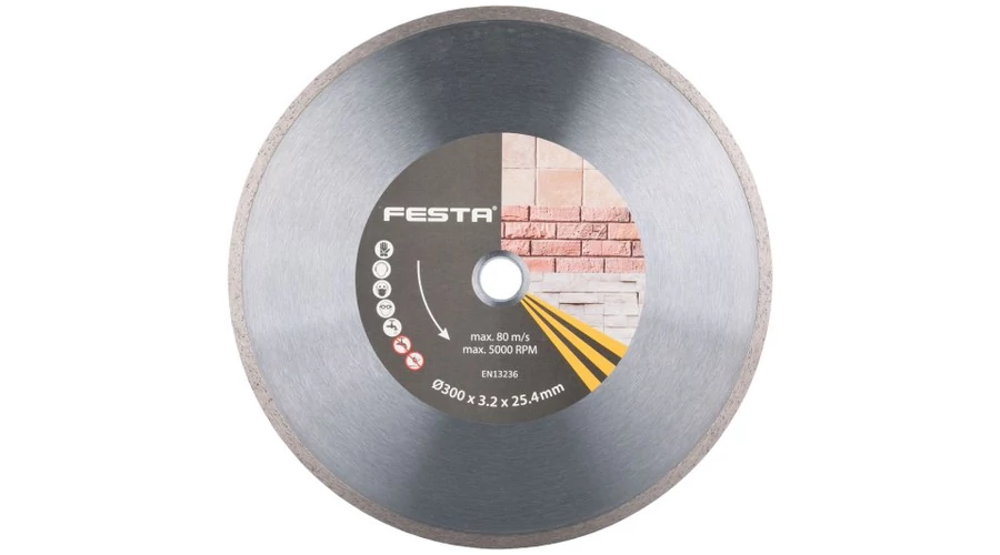 FESTA professzionális gyémántpenge, kivitel: FULL - körbefutó, kiváló minőségű gyémántréteg magas gyémántpor tartalommal, precíz megmunkálás - magas hőmérsékletnek ellenálló tárcsatartó koronghoz való csatlakozás, felhasználás: burkolat nedves és száraz vágására szolgál és csempézés, beton, tégla, falazat, gránit, márvány, kő, üveg, kerámia, csomagolás: eurólyukkal ellátott buborékfólia, méretek: a termék megnevezésében szerepel.