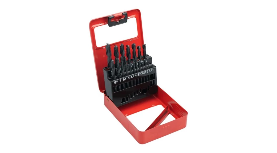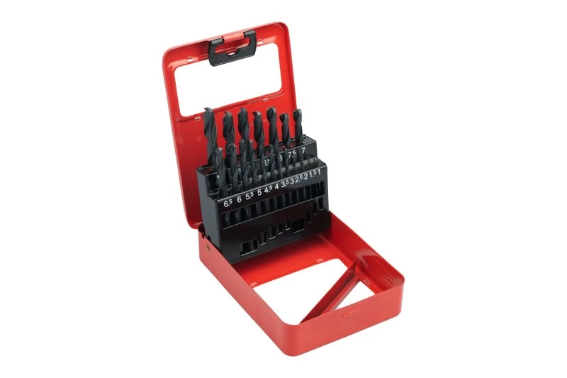 HSS fémfúró készlet, amely megfelel a DIN 338 szabványnak, a fúrók kiváló minőségű gyorsacélból (HSS), volfrám 4%, molibdén 3%, króm 4%, vanádium 1%. 19 db-os készletben, átmérő 1,0 - 10,0 mm.