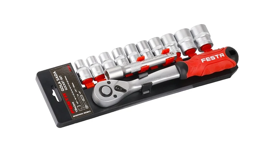 12 részes gola készlet 1/2 racsnival átlátszó rendszerezőben. Minden alkatrész kiváló minőségű króm-vanádium acélból készült, a racsnis finom osztású 72 fogas billenőkarral és kioldógombbal, a racsnis test CrV acélból, a fogszerkezet S2 acélból készült. Ergonomikusan kialakított fogantyú ártalmatlan gumival. 10 év garancia. Ipari és szolgáltatási használatra.