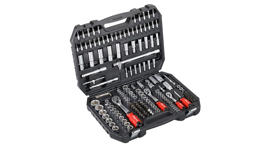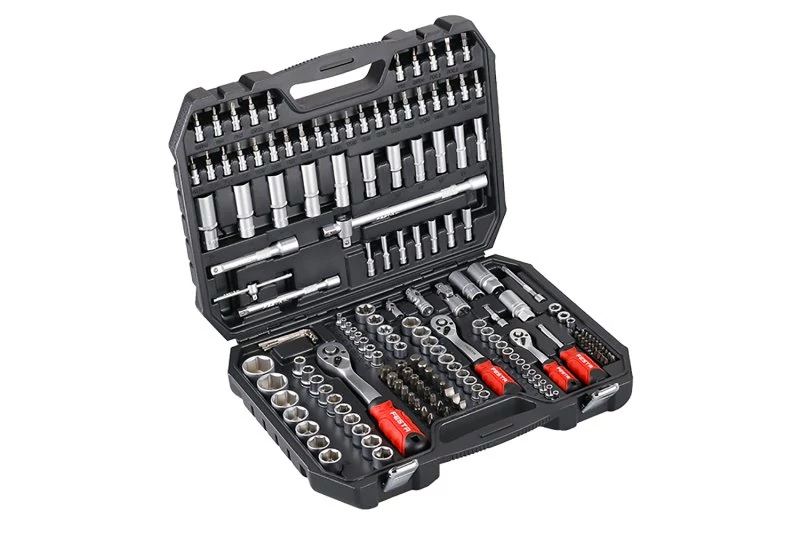 Fej- és hosszabbítókészlet 1/4,3/8,1/2. Minden alkatrész kovácsolással króm-vanádium acélból készült, jól kombinált készlet átlátszó műanyag tokban, racsnikkal billenőkarral és kioldógombbal, ergonomikusan kialakított fogantyúval.
