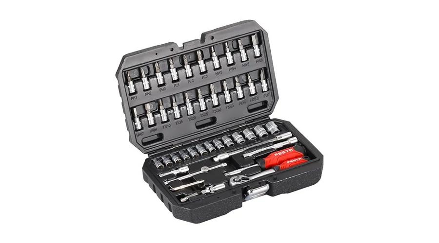 A kiváló minőségű gola készlet a felhasznált anyagok minősége és a professzionális autóműhelyben vagy szervizben történő feldolgozás miatt megfelelő. 10 év garancia. Minden alkatrész kiváló minőségű króm-vanádium acélból készül. Nikkel bevonat. A fúróhegyek S2 ötvözött acélból készültek. A racsnis 72 fogas finom felosztású, a racsnis teste CrV acélból, a fogszerkezet S2 acélból készült, a fogantyú pedig ergonomikus kialakítású, ártalmatlan gumival. Új kialakítású, elsődleges anyagból készült műanyag tok fém záródással és fedél zsanérokkal.