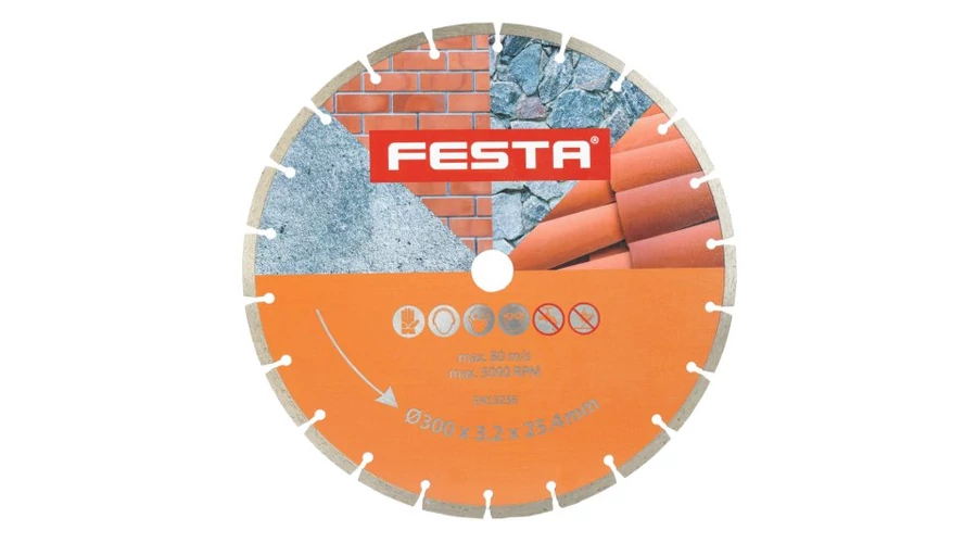 FESTA professzionális gyémántpenge, kialakítás: SZEGMENTES, kiváló minőségű anyagok és megmunkálás - a gyémánt szegmensek nagy szilárdságú rögzítése a penge tartótárcsájához, magas gyémántpor tartalom a szegmensekben, felhasználás: beton, tégla száraz vágásához , falazat, kő, ..., csomagolás: eurólyukkal ellátott buborékfólia, méretek: a termék megnevezésében szerepel.