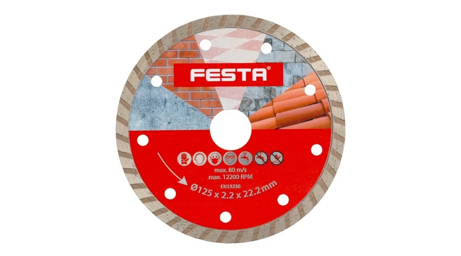 FESTA gyémánt tárcsa, kivitel: TURBO, kiváló minőségű anyagok és megmunkálás, speciális gyémánt szegmensek formája és felépítése és szilárd rögzítése a tárcsa tartótárcsájához, magas gyémántpor tartalom, felhasználás: beton száraz és nedves vágásához, erősített beton, tégla, falazat, kő, csomagolás : buborékfólia euro lyukkal, méretek : a termék megnevezésében szerepel.