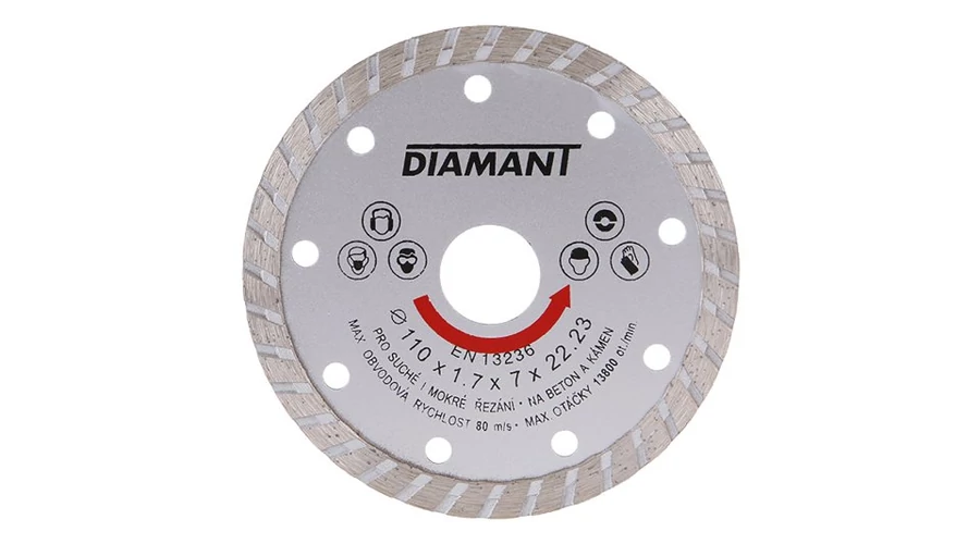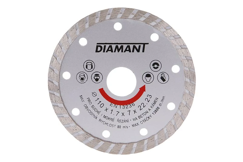 Gyémánt tárcsa DIAMANT, kialakítás: TURBO, kiváló minőségű anyagok és megmunkálás, speciális gyémánt szegmensek formája és felépítése és szilárd rögzítése a tárcsa tartótárcsájához, magas gyémántpor tartalom, felhasználás: beton száraz és nedves vágásához, erősített beton, tégla, falazat, kő, csomagolás: eurólyukkal ellátott buborékfólia, 22,2-20 mm-es szűkítő gyűrű mellékelve, méretek: a termék megnevezésében feltüntetve.