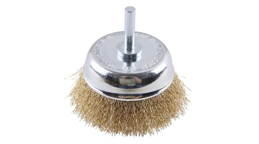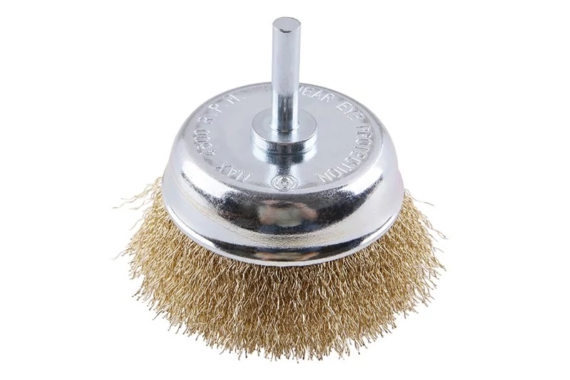 Forgókefe - csésze, kivitel: hullámos huzal 0,25 mm - sárgaréz, átmérő 68 mm, szár 6 x 27 mm, horganyzott kefetest, huzalok száma: 1728, huzalhossz: 19 mm, megengedett fordulatszám: 4500 1/. min , felhasználás: polírozáshoz, érdesítéshez, rozsda és sorja eltávolításához