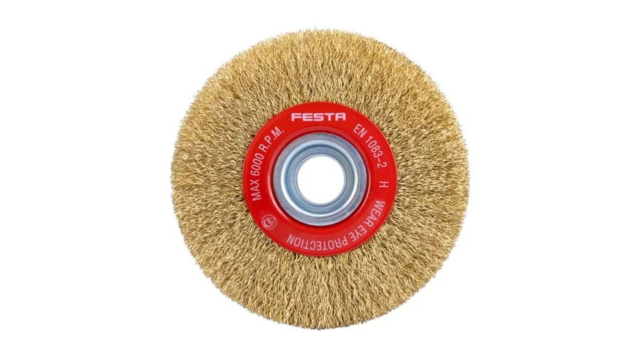 Forgókefe - kör alakú, kivitel: hullámos huzal, huzal 0,3 mm, FESTA kefék garantálják a kiváló minőségű felhasznált anyagokat és megmunkálást, átmérő 125 mm, rögzítési furat 20 mm (12,5 és 16 mm-es szűkítő gyűrűkkel együtt), huzalok száma 4950, huzal hossza 22 mm, maximális fordulat/perc. 6000, lakatos és fémmegmunkálási munkákra alkalmas, rozsda eltávolítás, festék, polírozás..., csomagolás: papírdoboz.