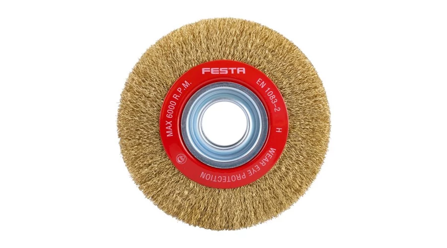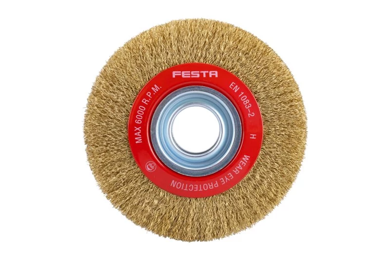 Forgókefe - kör alakú, kialakítás: hullámos huzal, FESTA kefék garantálják a minőségi felhasznált anyagokat és feldolgozást, huzal 0,3 mm - sárgaréz, átmérő 150 mm, rögzítési furat 32 mm (beleértve a szűkítő gyűrűket 12,7 mm - 1/2, 15,8 mm - 5 /8, 19 mm - 3/4, 22,2 mm és 25,4 mm - 1), vezetékek száma 7200, huzalhossz 30 mm, maximális fordulatszám percenként. 6000, lakatos és fémmegmunkálási munkákra alkalmas, rozsda eltávolítás, festék, polírozás..., csomagolás: papírdoboz.