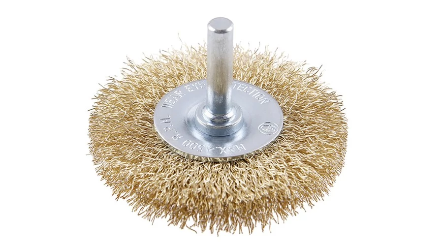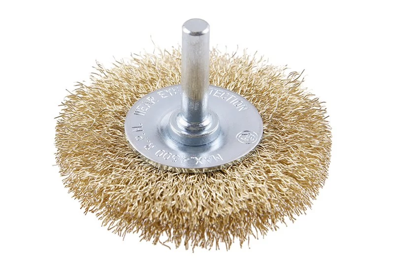 Forgókefe - kör alakú, kivitel: hullámos huzal 0,25 mm - sárgaréz, átmérő 60 mm, szár 6 x 27 mm, horganyzott kefetest, huzalok száma: 1080, huzalhossz: 15 mm, megengedett fordulatszám: 4500 1/. min, felhasználás : polírozáshoz, érdesítéshez, rozsda és sorja eltávolításához, csomagolás: eurolyukkal ellátott buborékfólia.