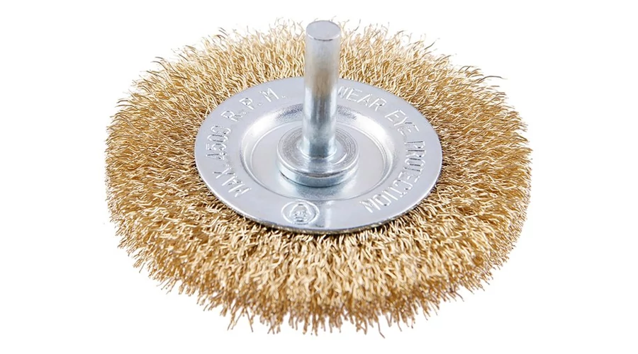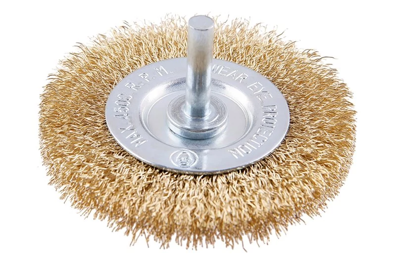Forgókefe - kör alakú, kivitel: hullámos huzal 0,25 mm - sárgaréz, átmérő 75 mm, szár 6 x 27 mm, horganyzott kefetest, huzalok száma: 1728, huzalhossz: 16 mm, megengedett fordulatszám: 4500 1/. min, felhasználás : polírozáshoz, érdesítéshez, rozsda és sorja eltávolításához, csomagolás: eurolyukkal ellátott buborékfólia.