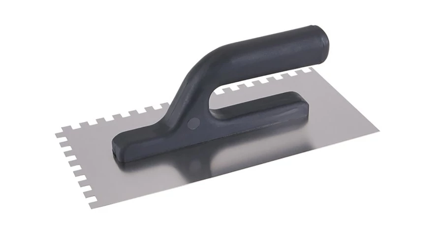 Rozsdamentes acél simító 270x125 mm műanyag nyéllel, e8 fogas, 0,7 mm lemezvastagság. A penge tökéletes formájú, edzett rozsdamentes acélból készült. Elsősorban csempék és burkolatok alá ragasztók felhordására, valamint esztrichek, stukkó, vakolatok, tömítőanyagok és egyéb építőanyagok felhordására használják.