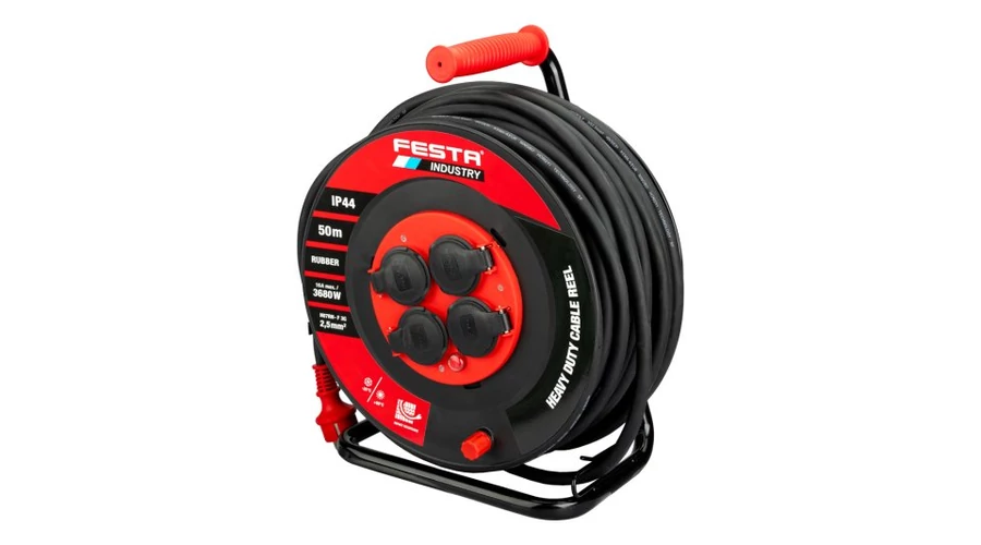 - hosszabbító kábel dobon 4 db 3 x 2,5 mm-es aljzattal 230 V-hoz, kültéri használatra - állandóan is