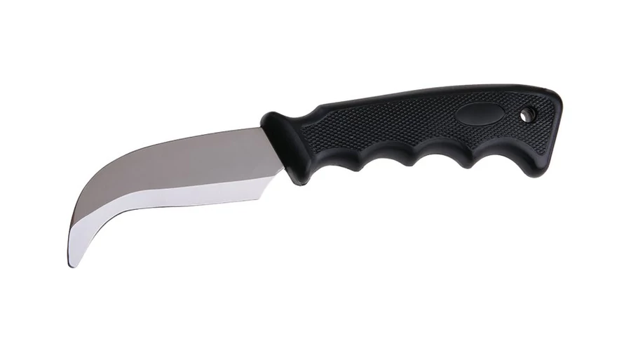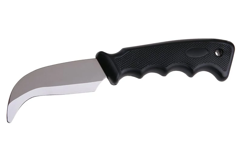Kés ívelt pengével, padló- és tetőburkolatok, szigetelések stb. vágására, lekerekített tompa hegyű penge, műanyag ergonomikus nyél, buborékfólia.