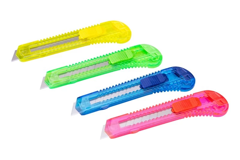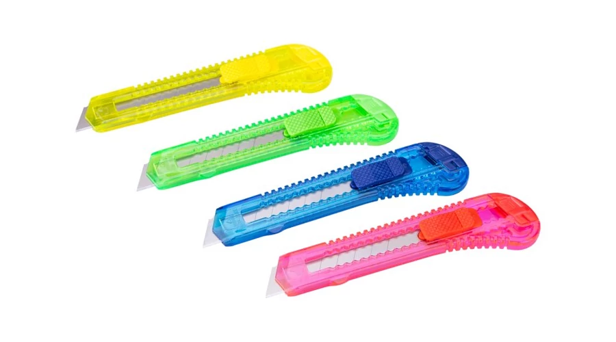 Műanyag bontókés készlet 18 mm, 12 db, műanyag kerek doboz, színkeverék.