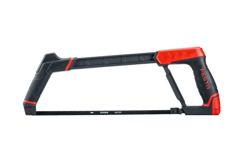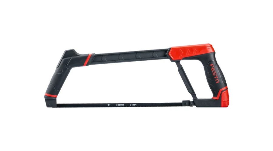 Alumínium váz, lágyított gumi PTR nyél, 300 mm-es acél penge edzett fogakkal, műanyag csavar a gyors pengecseréhez.