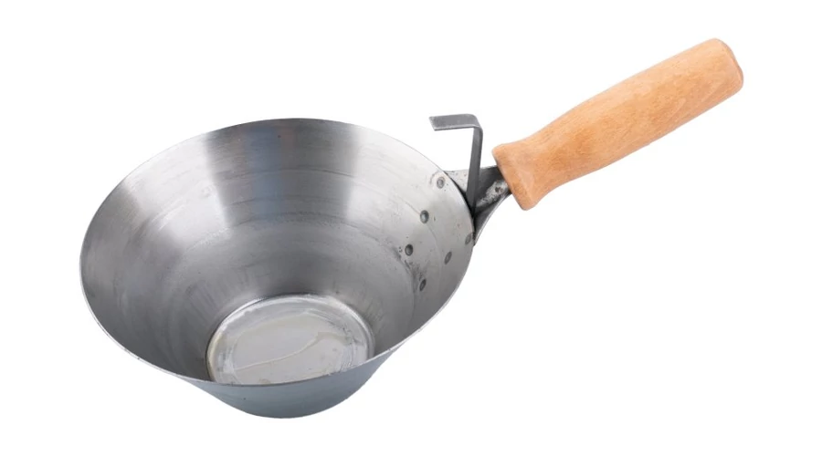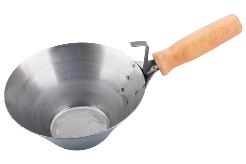 180 mm-es falazókanál fa nyéllel és akasztóval. Építőanyagok mozgatásához használt falazószerszámok: habarcs, beton stb.