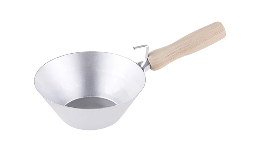 160 mm-es falazókanál fa nyéllel és akasztóval. Ez egy kőműves szerszám, amelyet építőanyagok mozgatására használnak: habarcs, beton stb.