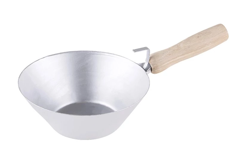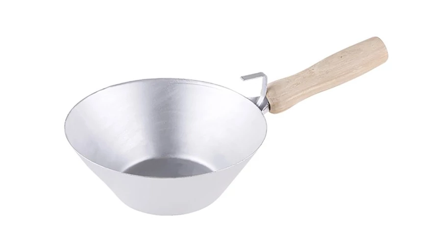 180 mm-es falazókanál fa nyéllel és akasztóval. Ez egy kőműves szerszám, amelyet építőanyagok mozgatására használnak: habarcs, beton stb.