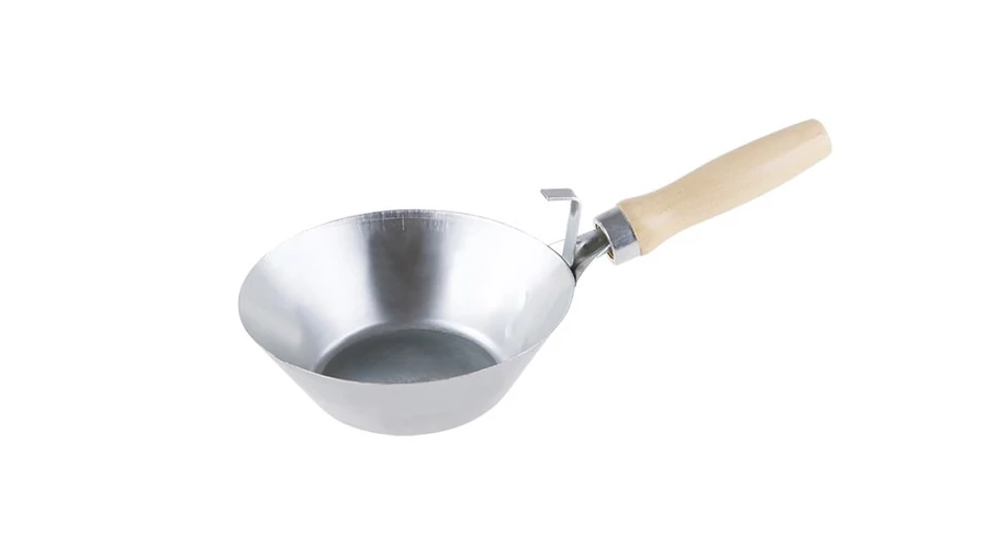 Kőműves üst horganyzott 180 mm, fa fogantyúval és akasztóval. Ez egy kőműves szerszám, amelyet építőanyagok mozgatására használnak: habarcs, beton stb.