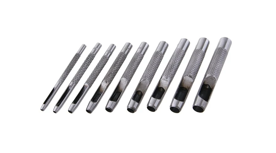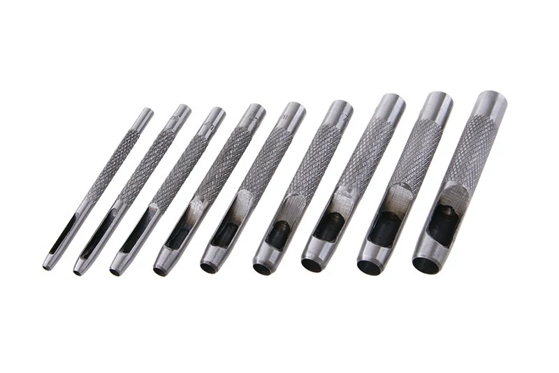Acél bőr ütések. A lyukasztók oldalsó hulladékleeresztővel vannak felszerelve. 9 db-os készlet. Lyukasztó átmérők: 2,5 mm, 3 mm, 4 mm, 5 mm, 6 mm, 7 mm, 8 mm, 9 mm, 10 mm.