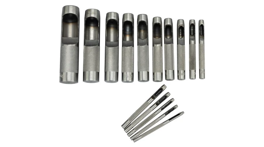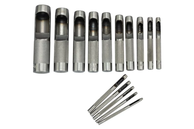 Acél bőr ütések. A lyukasztók oldalsó hulladékleeresztővel vannak felszerelve. 15 db-os készlet. Lyukasztó átmérők: 2 mm, 2,5 mm, 3,2 mm, 4 mm, 4,8 mm, 5 mm, 6,4 mm, 8 mm, 9,5 mm, 11,1 mm, 12,7 mm, 14 mm, 15,8 mm, 19 mm, 22 mm.