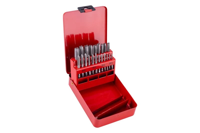 Menetfúró készlet - 21 részes, készlet menetfúrók, minőségi acél, precíz megmunkálás, belső menetek vágásához, előfúráshoz FESTA 4241 (19693...), W 9 (19550...) vagy Cobalt C5 professzionális fúrók használatát javasoljuk (22530... ), méretek: M 3, 4, 5, 6, 8, 10, 12, csomagolás - praktikus és strapabíró bádogdobozban tárolva.