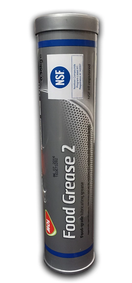 A MOL Food Grease 2 szintetikus alapolajjal és alumíniumkomplex sűrítővel készülő kenőzsír. NSF által regisztrált H1 kategóriájú termék: "Ez a termék élelmiszerekkel véletlenszerűen kapcsolatba kerülő (H1) kenőanyagként alkalmazható az élelmiszer-előállítás közvetlen és közvetett környezetében." Használatakor különös figyelmet kell fordítani arra, nehogy az élelmiszeripari minősítésű kenőanyagot egyéb kenőanyagok beszennyezzék. Szerkezete kémiailag ellenálló, ezért enyhén lúgos és savas környezetben is alkalmazható. Mérsékelten lágy, sárgásfehér színű termék. Alkalmazási hőmérséklettartomány: -30°C és +150°C között