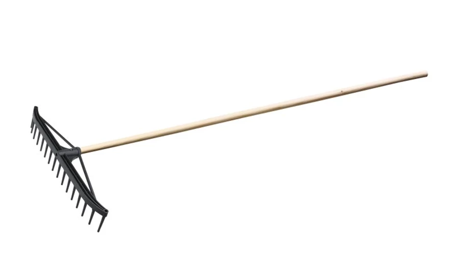 Műanyag gereblye, csapok száma 16, felhasználása: széna, fű gereblyézésére. Fa nyéllel 160 cm.