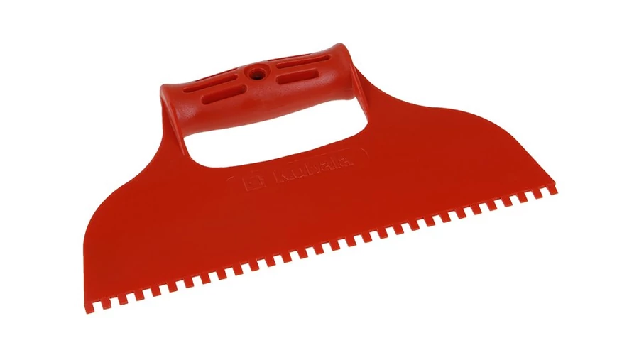 Műanyag simító, méret: 235 mm, fogak 4 x 6 mm, ergonómikus nyél, jó minőségű műanyag, felhasználás: vakolásnál, festésnél, falazásnál, alkalmas ragasztóhabarcsok felhordására, ahol szükséges a szimmetrikus ragasztóréteg biztosítása - anyag.