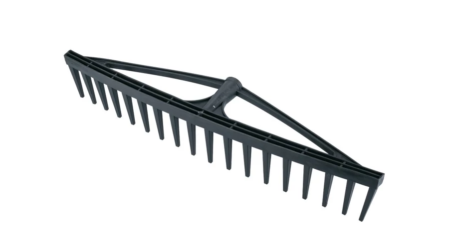 Műanyag gereblye, csapok száma 18, felhasználása: széna, fű gereblyézésére, nyél nélkül.