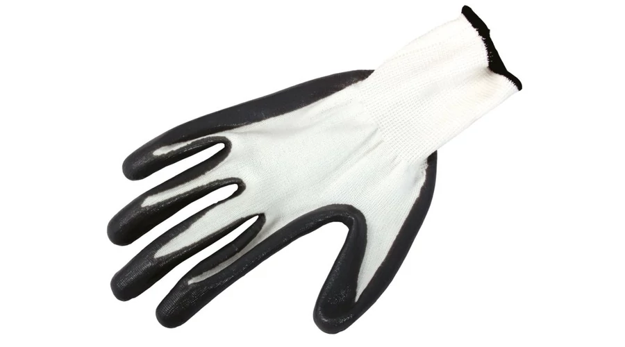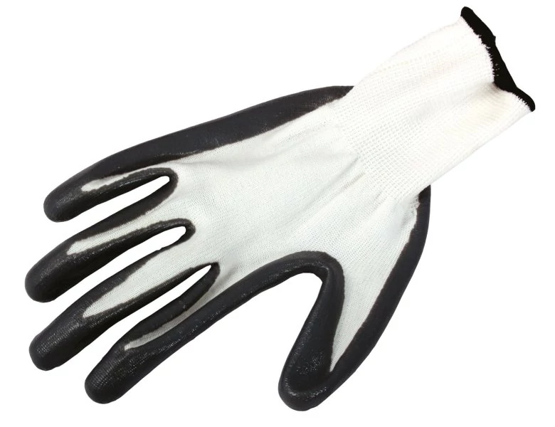 Fehér kötött finom nylonból, tenyér minőségi fekete nitrilbe mártva, CE EN 388, 10-es méret.