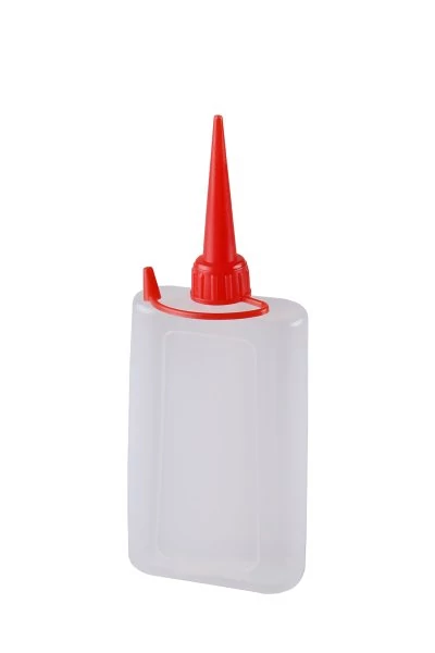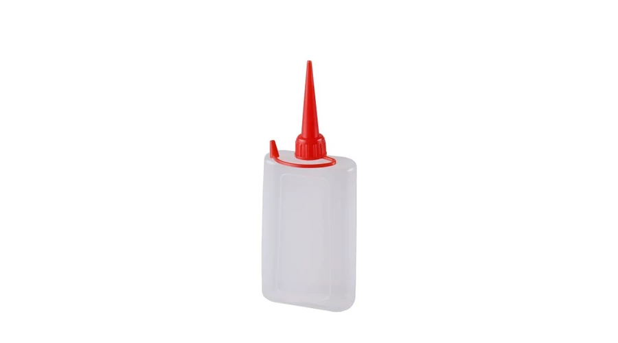 90 ml-es műanyag olajpalack, fehér, átlátszó tartály piros műanyag kifolyóval. Nagyon sokoldalúan használható különféle olajokkal történő kenéshez.
