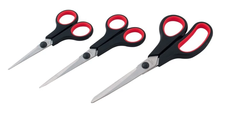 Három méretű, jól ergonómikus kialakítású ollókészlet, alkalmas irodai és művészeti használatra.