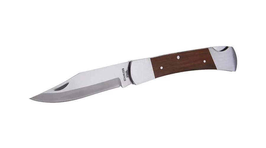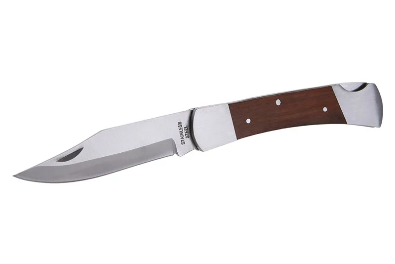 Összecsukható zsebkés zárral a penge véletlen bezáródása ellen, rozsdamentes penge, fa nyél, kiváló minőségű szegecselés, pengehossz 120 mm, buborékfólia.