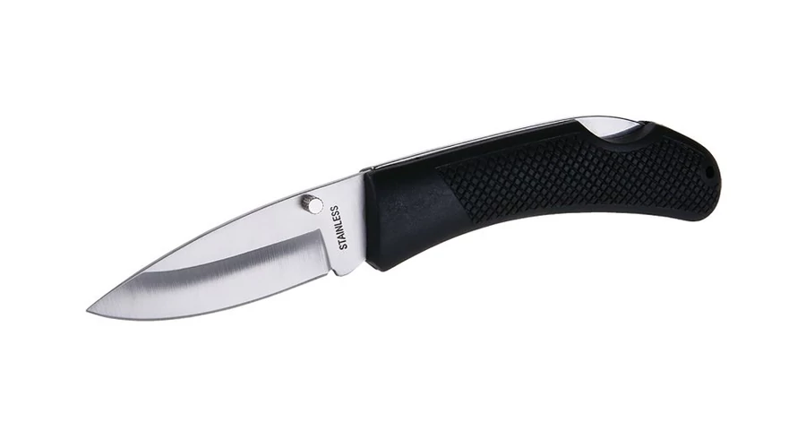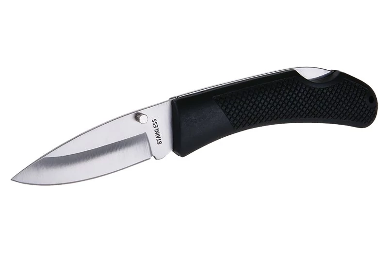 Összecsukható zsebkés biztonsági berendezéssel a penge véletlen bezáródása ellen, műanyag fogantyú, egykezes nyitás, rozsdamentes penge, kiváló minőségű szegecselés, pengehossz 120 mm, buborékfólia.