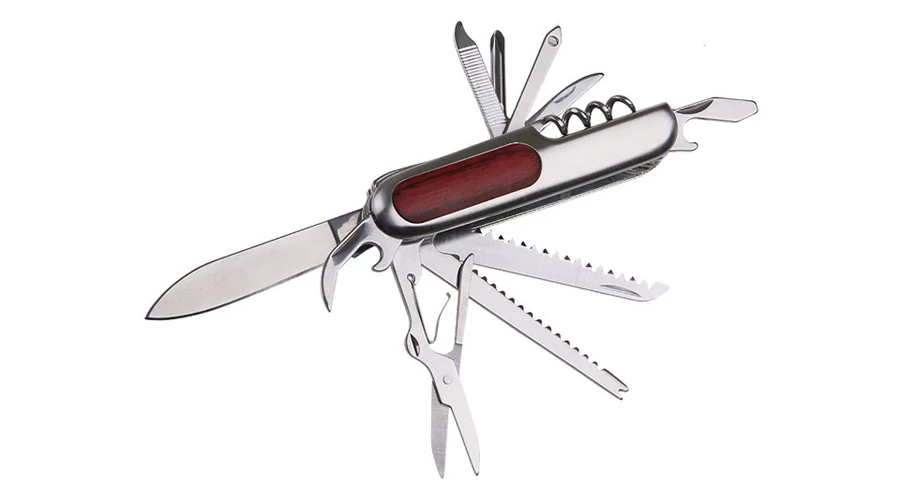 INOX multifunkcionális zsebkés. Zárt kés hossza 95 mm. Rozsdamentes acél multifunkcionális kés 11 különböző résszel, különböző felhasználási célokra. A fogantyú fém és fa kombinációja. Súlya 0,666 kg.