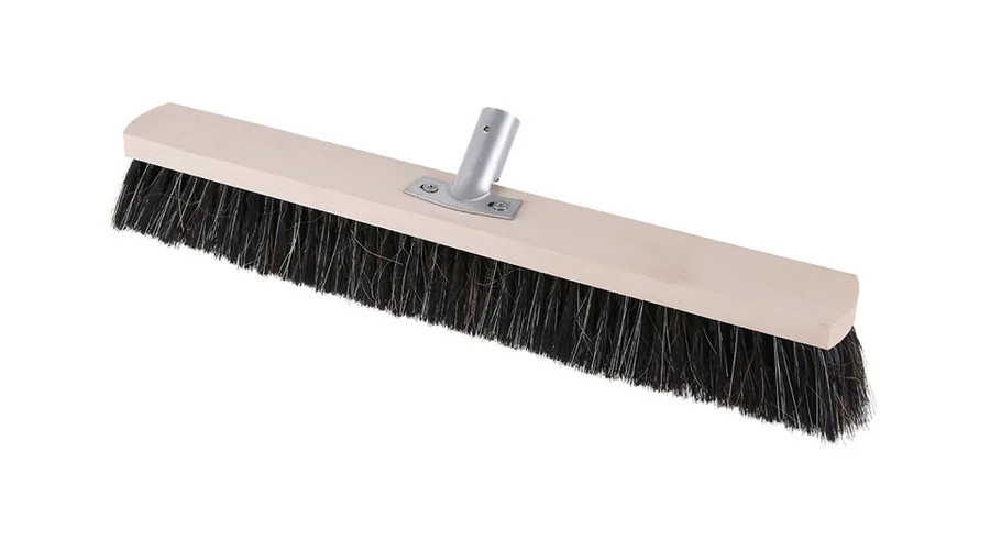 Klasszikus fa csarnokseprű fém tartóval, menet nélküli nyélhez. PET/gumi szálak.